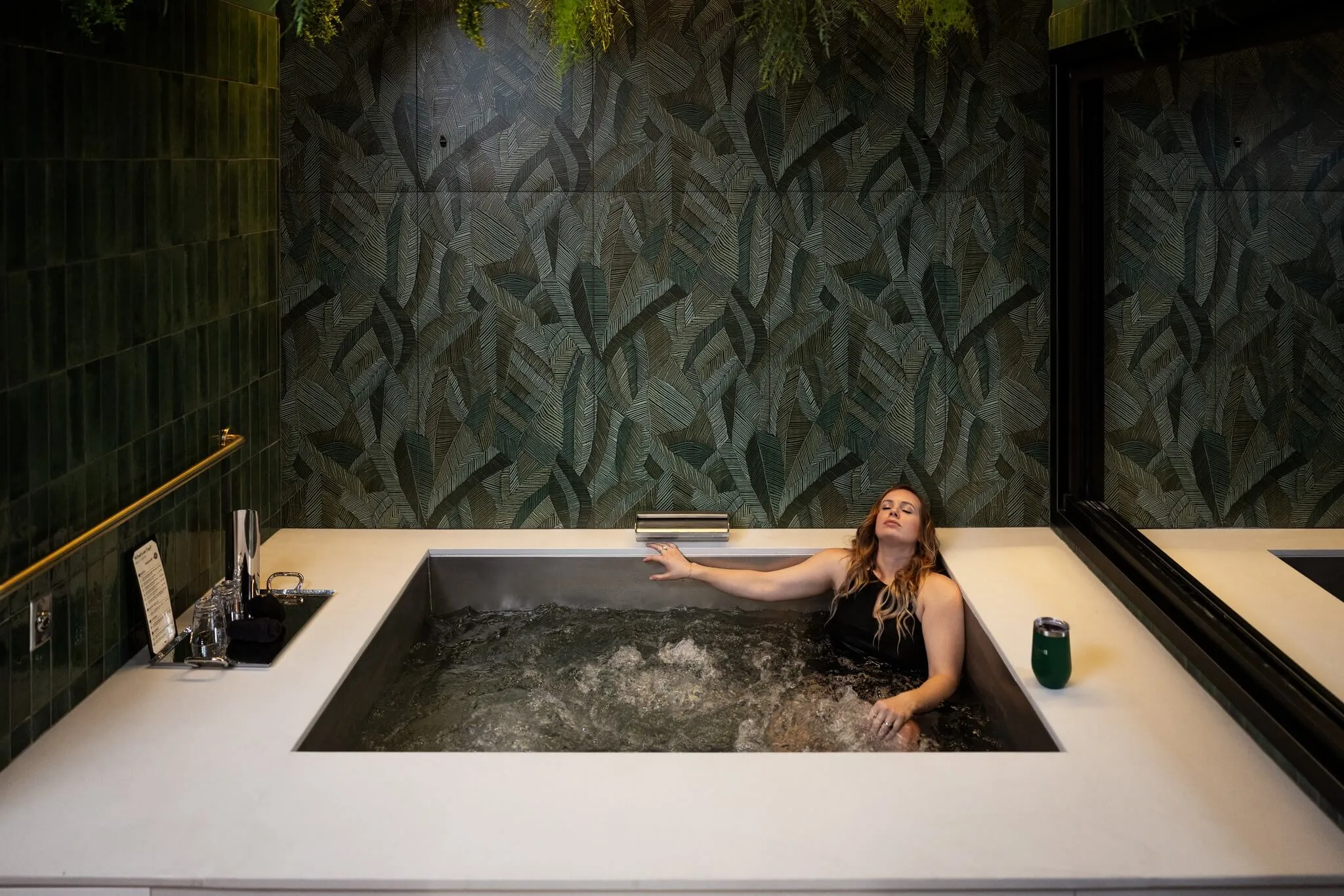 Your tub is cleaned and filled with fresh water and herbal ingredients for your session, so it feels like you’re the first person to ever use it. It’s similar to a warm, bubbly hot tub experience. The water is infused with hops, barley, and seasonal herbs that help calm the mind, body, and skin. There’s also a relaxation deck to rest outside of the water if you’d like.